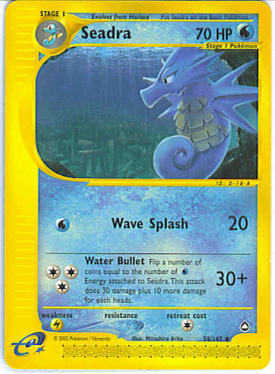 | Type | Water | | Pokemon serie | Aquapolis | | Stadie | Stage 1 | | HP | 70 | | Sjældenhed | Uncommon | | Tilbagetrækning | 1 | | Svaghed | L | | Kortnummer | 58 | | Evne | [W] Wave Splash (20) [CCC] Water Bullet (30+) Flip a coin for each W Energy card attached to Seadra. This attack does 30 damage plus 10 damage for each heads.