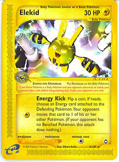 | Type | Lightning | | Pokemon serie | Aquapolis | | Stadie | Baby | | HP | 30 | | Sjældenhed | Rare | | Tilbagetrækning | 1 | | Kortnummer | 9 | | Evne | [L] Energy Kick - If your opponent has any Benched Pokemon, flip a coin. If heads, he or she chooses 1 of his or her Benched Pokemon and 1 Energy card attached to the Defending Pokemon, if any. Attach that Energy card to that Pokemon.