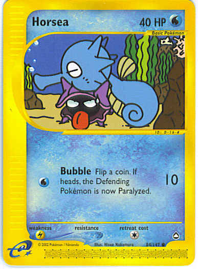 | Type | Water | | Pokemon serie | Aquapolis | | Stadie | Basic | | HP | 40 | | Sjældenhed | Common | | Tilbagetrækning | 1 | | Svaghed | L | | Kortnummer | 84 | | Evne | [W] Bubble (10) Flip a coin. If heads, the Defending Pokemon is now Paralyzed.