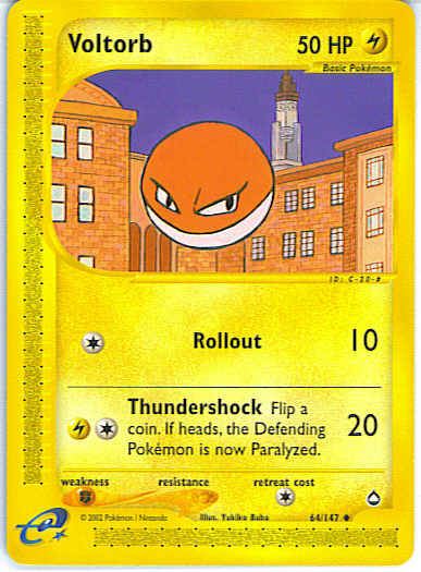 | Type | Lightning | | Pokemon serie | Aquapolis | | Stadie | Basic | | HP | 50 | | Sjældenhed | Uncommon | | Tilbagetrækning | 1 | | Svaghed | F | | Kortnummer | 64 | | Evne | [C] Rollout (10) [CL] Thundershock (20) Flip a coin. If heads, the Defending Pokemon is now Paralyzed.