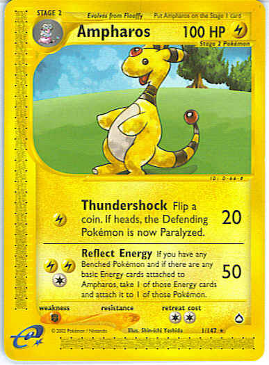| Type | Lightning | | Pokemon serie | Aquapolis | | Stadie | Stage 2 | | HP | 100 | | Sjældenhed | Rare | | Tilbagetrækning | 2 | | Svaghed | F | | Kortnummer | 1 | | Evne |