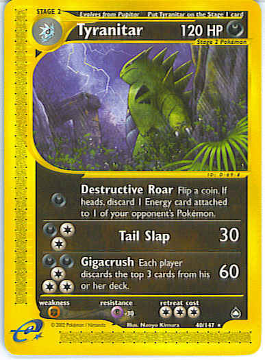 | Type | Darkness | | Pokemon serie | Aquapolis | | Stadie | Stage 2 | | HP | 120 | | Sjældenhed | Rare | | Tilbagetrækning | 3 | | Modstand | P | | Svaghed | F | | Kortnummer | 40 | | Evne | [D] Destructive Roar - Flip a coin. If heads, discard an Energy card attached to 1 of your opponent's Pokemon with any attached to it. [CCD] Tail Slap (30) [CCCDD] Gigacrush (60) Each player discards the top 3 cards of his or her deck.