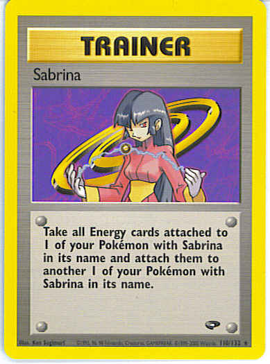 Take all Energy cards attached to 1 of your Pokemon with Sabrina in its name and attach them to another 1 of your Pokemon with Sabrina in its name.