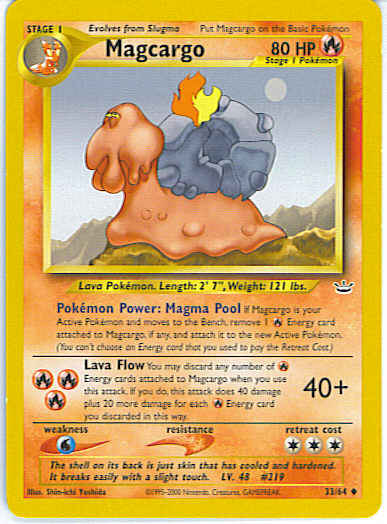 | Type | Fire | | Pokemon serie | Neo Revelation | | Stadie | Stage 1 | | HP | 80 | | Sjældenhed | Uncommon | | Tilbagetrækning | 3 | | Svaghed | W | | Kortnummer | 33 | | Evne |
