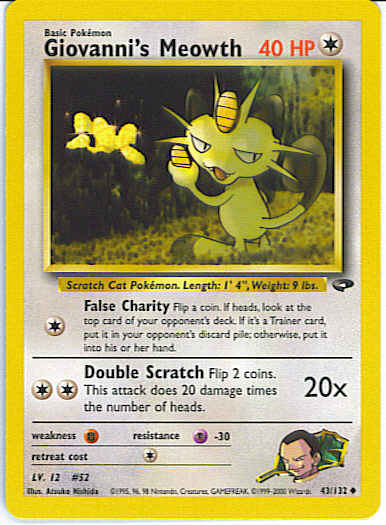 | Type | Colorless | | Pokemon serie | Gym Challenge | | Stadie | Basic | | HP | 40 | | Sjældenhed | Uncommon | | Tilbagetrækning | 1 | | Modstand | P | | Svaghed | F | | Kortnummer | 43 | | Evne |