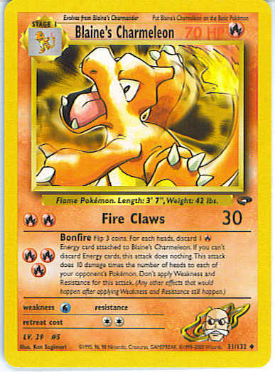 [RRR] Bonfire - Flip 3 coins. For each heads, discard 1 R Energy card attached to Blaine's Charmeleon. If you can't discard Energy cards, this attack does nothing. This attack does 10 damage times the number of heads to each of your opponent's Pokemon. Don't apply Weakness and Resistance for this attack. (Any other effects that would happen after applying Weakness and Resistance still happen.)