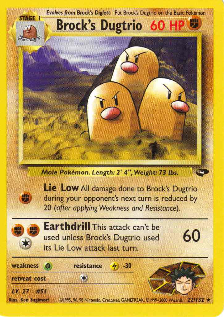 [F] Lie Low - All damage done to Brock's Dugtrio during your opponent's next turn is reduced by 20 (after applying Weakness and Resistance).