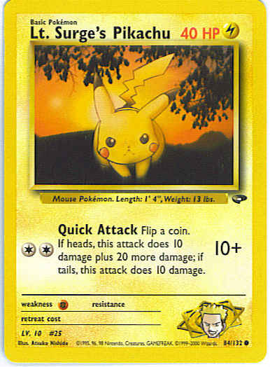 | Type | Lightning | | Pokemon serie | Gym Challenge | | Stadie | Basic | | HP | 40 | | Sjældenhed | Common | | Svaghed | F | | Kortnummer | 84 | | Evne |
