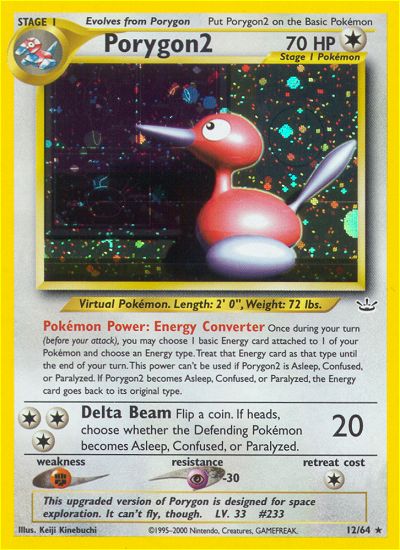 | Type | Colorless | | Pokemon serie | Neo Revelation | | Stadie | Stage 1 | | HP | 70 | | Sjældenhed | Rare | | Tilbagetrækning | 1 | | Modstand | P | | Svaghed | F | | Kortnummer | 12 | | Evne |