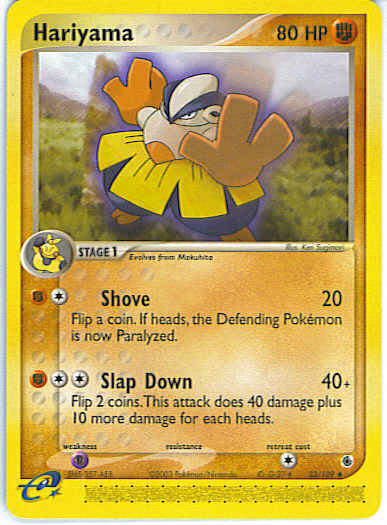 | Type | Fighting | | Pokemon serie | Ruby Sapphire | | Stadie | Stage 1 | | HP | 80 | | Sjældenhed | Uncommon | | Tilbagetrækning | 1 | | Svaghed | P | | Kortnummer | 33 | | Evne | [CF] Shove (20) Flip a coin. If heads, the Defending Pokemon is now Paralyzed. [CCF] Slap Down (40+) Flip 2 coins. This attack does 40 damage plus 10 more damage for each heads.