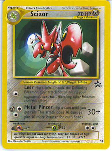[C] Leer - Flip a coin. If heads, the Defending Pokemon can't attack Scizor during your opponent's next turn. (Benching either Pokemon ends this effect.)