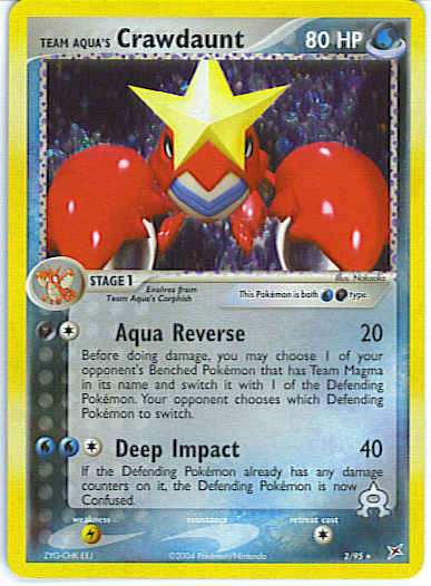 | Type | Darkness Water | | Pokemon serie | Team Aqua-Team Magma | | Stadie | Stage 1 | | HP | 80 | | Sjældenhed | Rare | | Tilbagetrækning | 1 | | Svaghed | L | | Kortnummer | 2 | | Evne | [CD] Aqua Reverse (20) Before doing damage, you may choose 1 of your opponent's Benched Pokemon that has Team Magma in its name and switch it with 1 of the Defending Pokemon. Your opponent chooses which Defending Pokemon to switch. [CWW] Deep Impact (40) If the Defending Pokemon already has any damage counters on it, the Defending Pokemon is now Confused.