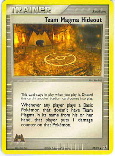 | Type | Trainer | | Pokemon serie | Team Aqua-Team Magma | | Stadie | Trainer (Stadium) | | Sjældenhed | Uncommon | | Kortnummer | 83 | | Evne | Whenever any player plays a Basic Pokemon that doesn't have Team Magma in its name from his or her hand, that player puts 1 damage counter on that Pokemon.
