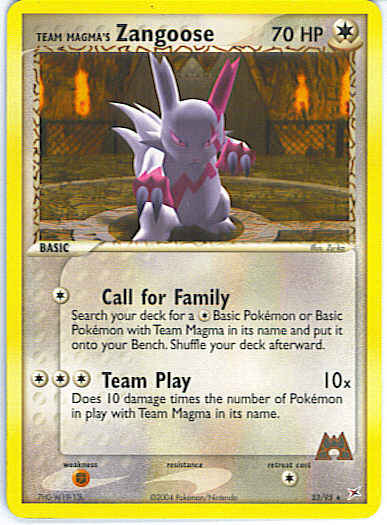 | | Evne2 | [C] Call for Family - Search your deck for a Colorless Basic Pokemon or Basic Pokemon with Team Magma in its name and put it onto your Bench. Shuffle your deck afterward. [CCC] Team Play (10x) Does 10 damage times the number of Pokemon in play with Team Magma in its name.