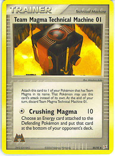 | Type | Trainer | | Pokemon serie | Team Aqua-Team Magma | | Stadie | Trainer (Technical Machine) | | Sjældenhed | Uncommon | | Kortnummer | 84 | | Evne | [C] Crushing Magma (10) Choose an Energy card attached to the Defending Pokemon and put that card at the bottom of your opponent's deck.