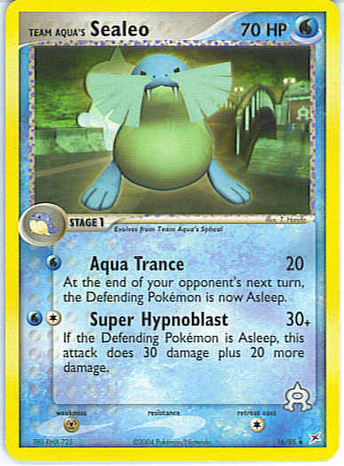 | Type | Water | | Pokemon serie | Team Aqua-Team Magma | | Stadie | Stage 1 | | HP | 70 | | Sjældenhed | Rare | | Tilbagetrækning | 1 | | Svaghed | M | | Kortnummer | 16 | | Evne | [W] Aqua Trance (20) At the end of your opponent's next turn, the Defending Pokemon is now Asleep. [CW] Super Hypnoblast (30+) If the Defending Pokemon is Asleep, this attack does 30 damage plus 20 more damage.
