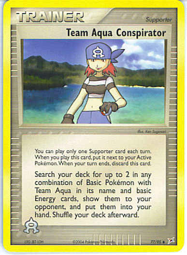 | Type | Trainer | | Pokemon serie | Team Aqua-Team Magma | | Stadie | Trainer (Supporter) | | Sjældenhed | Uncommon | | Kortnummer | 77 | | Evne | Search your deck for up to 2 in any combination of Basic Pokemon with Team Aqua in its name and basic Energy cards, show them to your opponent, and put them into your hand. Shuffle your deck afterward.