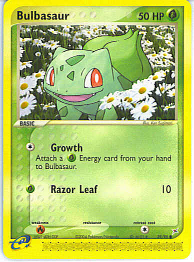 | Type | Grass | | Pokemon serie | Team Aqua-Team Magma | | Stadie | Basic | | HP | 50 | | Sjældenhed | Common | | Tilbagetrækning | 1 | | Svaghed | R | | Kortnummer | 39 | | Evne | [C] Growth - Attach a G Energy card from your hand to Bulbasaur. [G] Razor Leaf (10)
