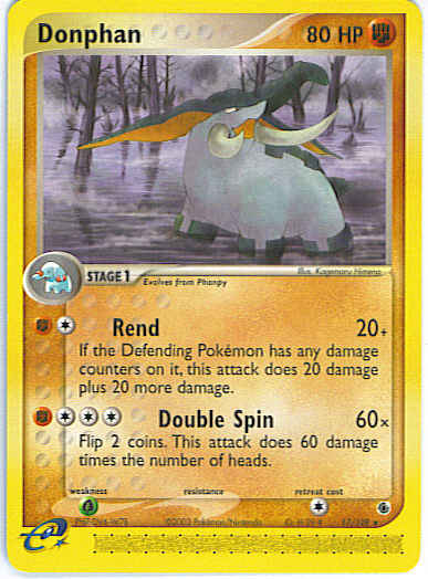 | | Evne2 | [CF] Rend (20+) If the Defending Pokemon has any damage counters on it, this attack does 20 damage plus 20 more damage. [CCCF] Double Spin (60x) Flip 2 coins. This attack does 60 damage times the number of heads.