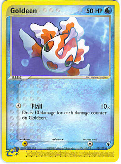 | Type | Water | | Pokemon serie | Ruby Sapphire | | Stadie | Basic | | HP | 50 | | Sjældenhed | Common | | Tilbagetrækning | 1 | | Svaghed | L | | Kortnummer | 55 | | Evne | [C] Flail (10x) Does 10 damage for each damage counter on Goldeen.