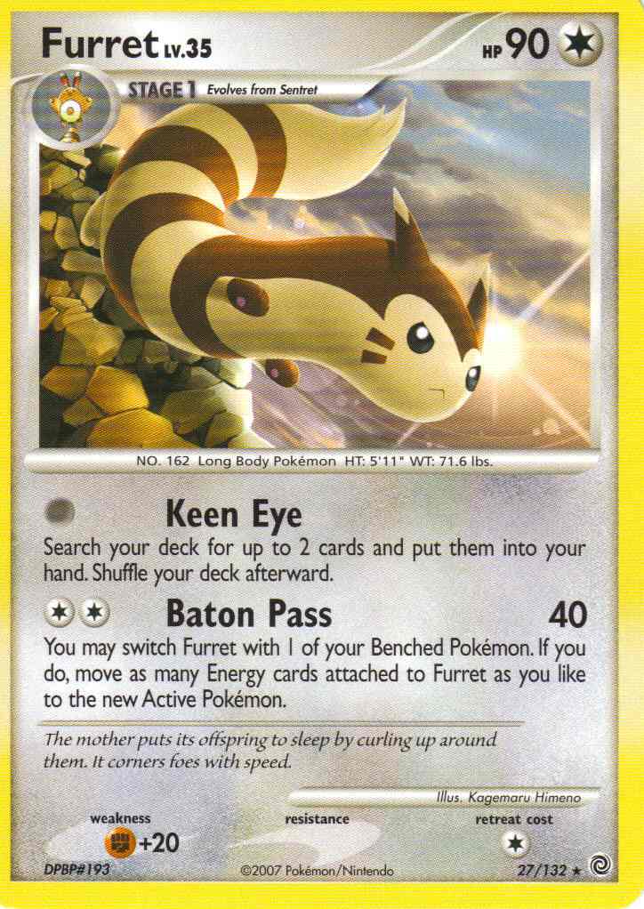 [CC] Baton Pass (40) You may switch Furret with 1 of your Benched Pokemon. If you do, move as many Energy cards attached to Furret as you like to the new Active Pokemon.