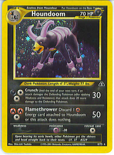 | Type | Darkness | | Pokemon serie | Neo Discovery | | Stadie | Stage 1 | | HP | 70 | | Sjældenhed | Rare | | Tilbagetrækning | 1 | | Modstand | P | | Kortnummer | 4 | | Evne |