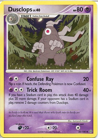 [CCP] Trick Room (40+) If you have a Stadium card in play, this attack does 40 damage plus 20 more damage. If your opponent has a Stadium card in play, remove 2 damage counters from Dusclops.