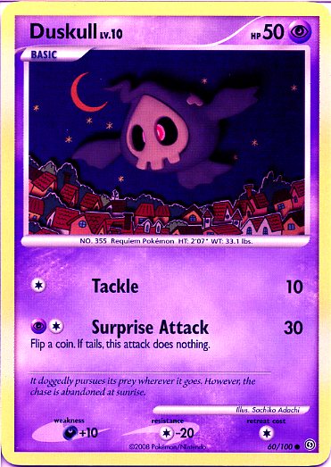 | Type | Psychic | | Pokemon serie | Stormfront | | Stadie | Basic | | HP | 50.0 | | Sjældenhed | Common | | Tilbagetrækning | 1.0 | | Modstand | C-20 | | Svaghed | D+10 | | Kortnummer | 60 | | Evne |