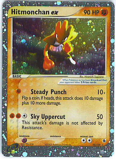 | Type | Fighting | | Pokemon serie | Ruby Sapphire | | Stadie | Basic | | HP | 90 | | Sjældenhed | Ultra-Rare | | Tilbagetrækning | 2 | | Svaghed | P | | Kortnummer | 98 | | Evne | [F] Steady Punch (10+) Flip a coin. If heads, this attack does 10 damage plus 10 more damage. [CCFF] Sky Uppercut (50) This attack's damage is not affected by Resistance.