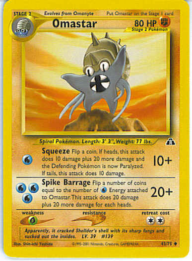[WWW] Spike Barrage (20+) Flip a number of coins equal to the number of W Energy attached to Omastar. This attack does 20 damage plus 20 more for each heads.