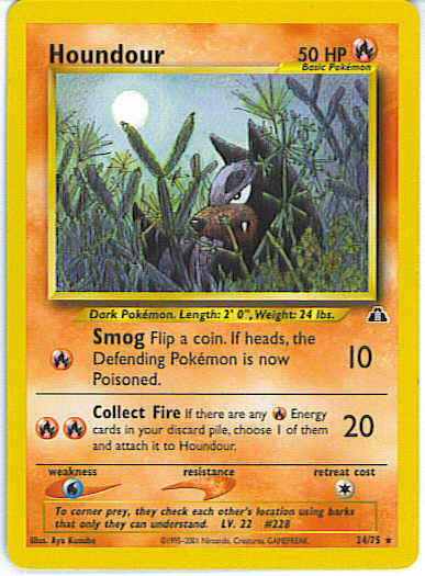| Type | Fire | | Pokemon serie | Neo Discovery | | Stadie | Basic | | HP | 50 | | Sjældenhed | Rare | | Tilbagetrækning | 1 | | Svaghed | W | | Kortnummer | 24 | | Evne |