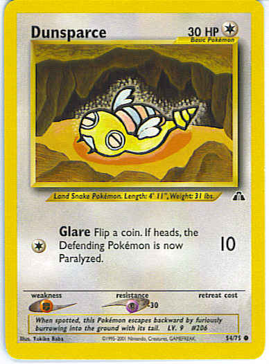 | Type | Colorless | | Pokemon serie | Neo Discovery | | Stadie | Basic | | HP | 30 | | Sjældenhed | Common | | Modstand | P | | Svaghed | F | | Kortnummer | 54 | | Evne |