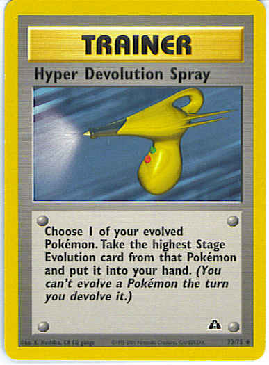 Choose 1 of your Evolved Pokemon. Take the highest stage Evolution card from that Pokemon and put it into your hand. (You can't evolve a Pokemon the turn you devolve it.)