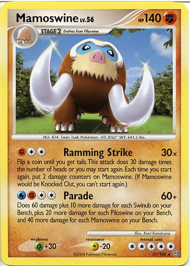 [CCF] Ramming Strike (30x) Flip a coin until you get tails. This attack does 30 damage times the number of heads or you may start again. Each time you start again, put 2 damage counters on Mamoswine. (If Mamoswine would be Knocked Out, you can't start again.)