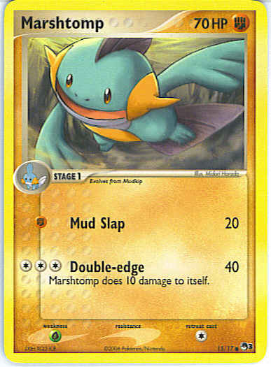| Type | Fighting | | Pokemon serie | OP Series 3 | | Stadie | Stage 1 | | HP | 70 | | Sjældenhed | Common | | Tilbagetrækning | 1 | | Svaghed | G | | Kortnummer | 15 | | Evne | [F] Mud Slap (20) [CCC] Double-edge (40) Marshtomp does 10 damage to itself.