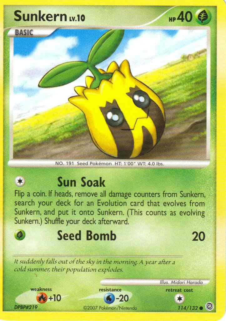 [C] Sun Soak - Flip a coin. If heads, remove all damage counters from Sunkern, search your deck for an Evolution card that evolves from Sunkern, and put it onto Sunkern. (This counts as evolving Sunkern.) Shuffle your deck afterward.