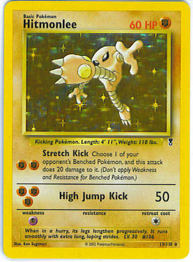 | Type | Fighting | | Pokemon serie | Legendary Collection | | Stadie | Basic | | HP | 60 | | Sjældenhed | Rare | | Tilbagetrækning | 1 | | Svaghed | P | | Kortnummer | 13 | | Evne |