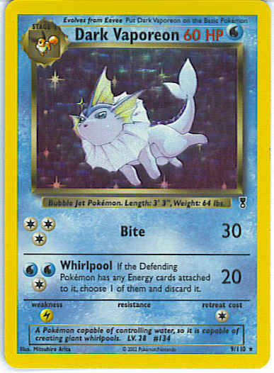 | Type | Water | | Pokemon serie | Legendary Collection | | Stadie | Stage 1 | | HP | 60 | | Sjældenhed | Rare | | Tilbagetrækning | 1 | | Svaghed | L | | Kortnummer | 9 | | Evne |