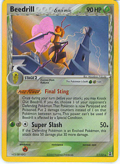 | Type | Metal Grass | | Pokemon serie | Delta Species | | Stadie | Stage 2 | | HP | 90 | | Sjældenhed | Rare | | Svaghed | R | | Kortnummer | 1 | | Evne |