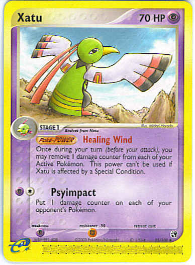 | Type | Psychic | | Pokemon serie | Sandstorm | | Stadie | Stage 1 | | HP | 70 | | Sjældenhed | Uncommon | | Modstand | F | | Svaghed | P | | Kortnummer | 55 | | Evne | [CP] Psyimpact - Put 1 damage counter on each of your opponent's Pokemon.