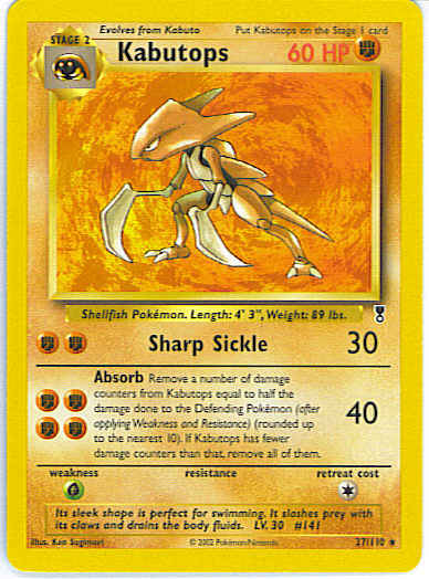 [FFFF] Absorb (40) Remove a number of damage counters from Kabutops equal to half the damage done to Defending Pokemon (after applying Weakness and Resistance) (rounded up to the nearest 10). If Kabutops has fewer damage counters than that, remove all of them.