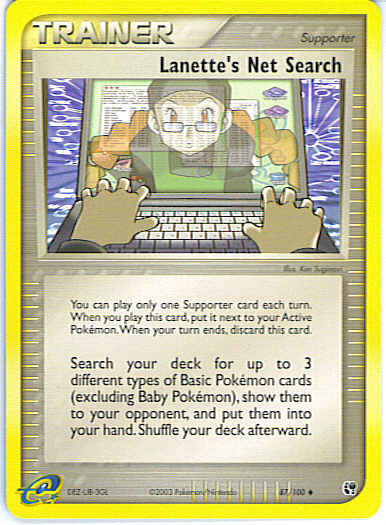 Search your deck for up to 3 different types of Basic Pokemon cards (excluding Baby Pokemon), show them to your opponent and put them into your hand. Shuffle your deck afterward.