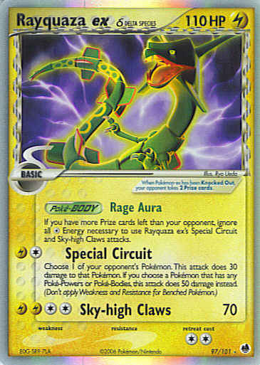 | Type | Lightning | | Pokemon serie | Dragon Frontiers | | Stadie | Basic | | HP | 110 | | Sjældenhed | Ultra-Rare | | Tilbagetrækning | 2 | | Kortnummer | 97 | | Evne | [CL] Special Circuit - Choose 1 of your opponent's Pokemon. This attack does 30 damage to that Pokemon. If you choose a Pokemon that has any Poke-Powers or Poke-Bodies, this attack does 50 damage instead. (Don't apply Weakness and Resistance for Benched Pokemon.) [CCLL] Sky-high Claws (70)