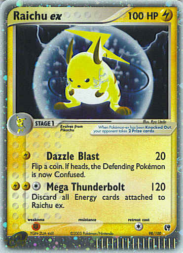 | | Evne2 | [L] Dazzle Blast (20) Flip a coin. If heads, the Defending Pokemon is now Confused. [CLL] Mega Thunderbolt (120) Discard all Energy cards attached to Raichu ex.