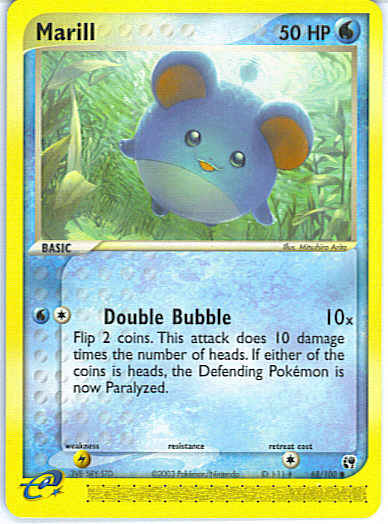 | Type | Water | | Pokemon serie | Sandstorm | | Stadie | Basic | | HP | 50 | | Sjældenhed | Common | | Svaghed | L | | Kortnummer | 68 | | Evne | [CW] Double Bubble (10x) Flip 2 coins. This attack does 10 damage times the number of heads. If either of the coins is heads, the Defending Pokemon is now Paralyzed.