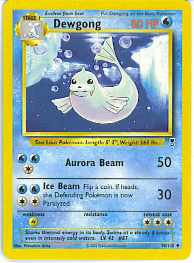 | Type | Water | | Pokemon serie | Legendary Collection | | Stadie | Stage 1 | | HP | 80 | | Sjældenhed | Uncommon | | Tilbagetrækning | 3 | | Svaghed | L | | Kortnummer | 40 | | Evne |