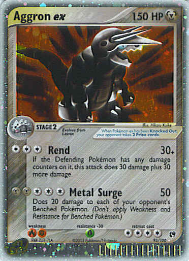 | | Evne2 | [CCC] Rend (30+) If the Defending Pokemon has any damage counters on it, this attack does 30 damage plus 30 more damage. [CCCMM] Metal Surge (50) Does 20 damage to each of your opponent's Benched Pokemon. (Don't apply Weakness and Resistance for Benched Pokemon.)