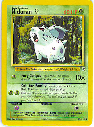 [GG] Call for Family - Search your deck for a Basic Pokemon named Nidoran M or Nidoran F and put it onto your Bench. Shuffle your deck afterward. (You can't use this attack if your Bench is full.)