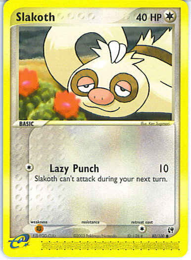 | Type | Colorless | | Pokemon serie | Sandstorm | | Stadie | Basic | | HP | 40 | | Sjældenhed | Common | | Tilbagetrækning | 1 | | Svaghed | F | | Kortnummer | 80 | | Evne | [C] Lazy Punch (10) Slakoth can't attack during your next turn.