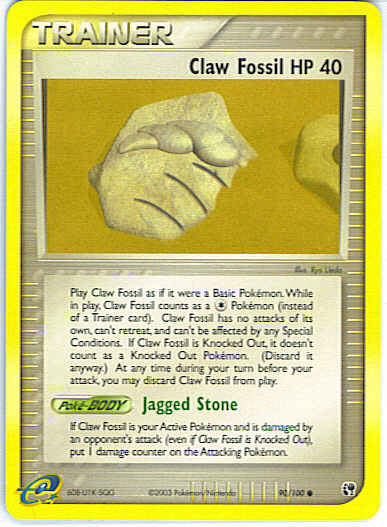 Play Claw Fossil as if it were a Basic Pokemon. While in play, Claw Fossil counts as a C Pokemon (instead of a Trainer card). Claw Fossil has no attacks of it's own, can't retreat, and can't be affected by any Special Conditions. If Claw Fossil is Knocked Out, it doesn't count as a Knocked Out Pokemon. (Discard it anyway.) At any time during your turn before your attack, you may discard Claw Fossil from play.